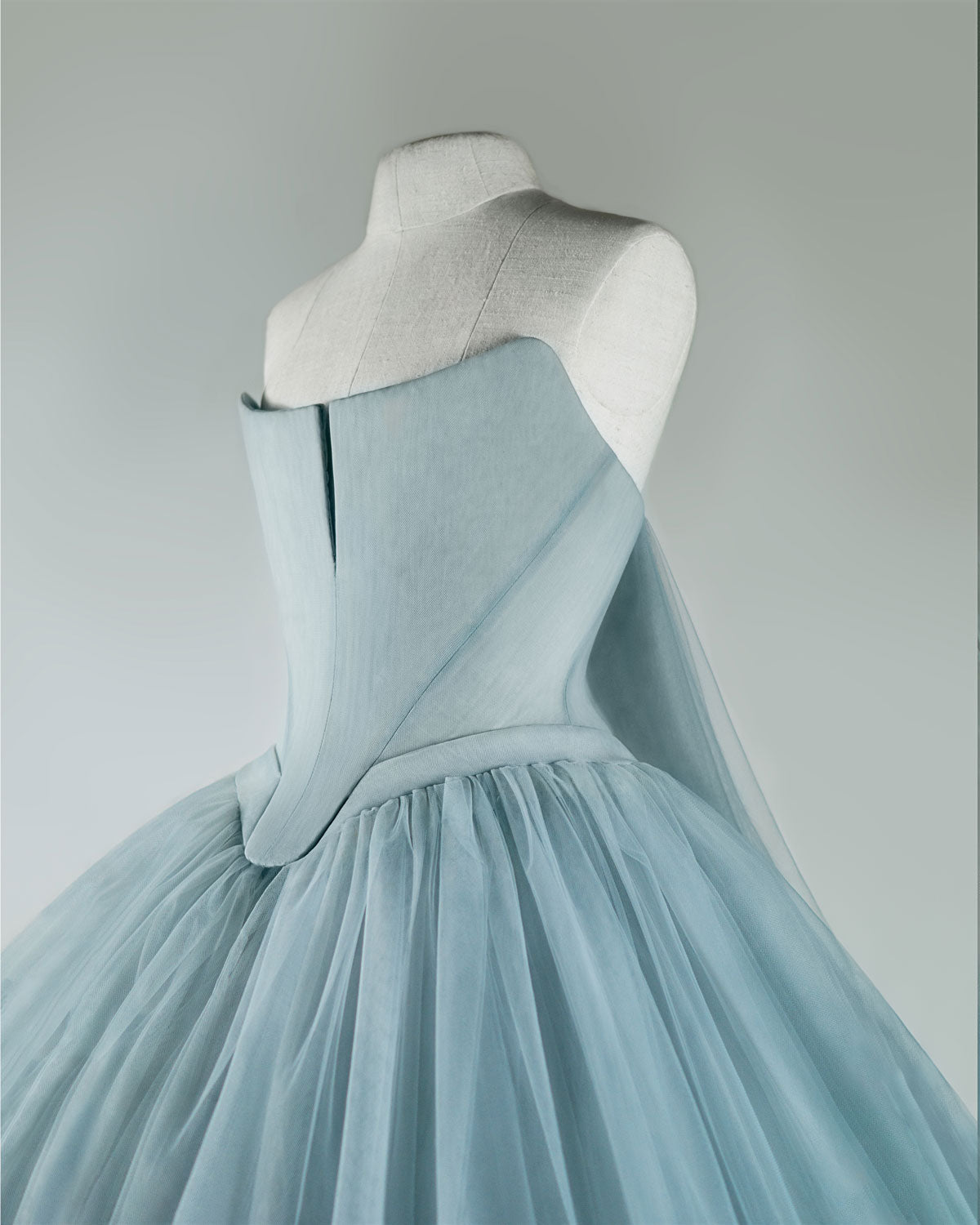 With this dress you can clearly see the interaction of the past and the future. The bodice is constructed from a historical cut for stays from the 18th century and blends into a modern tulle skirt at the waist. The low back is reminiscent of the Watteau pleats popular in the 18th century, yet looks very modern thanks to the light tulle.