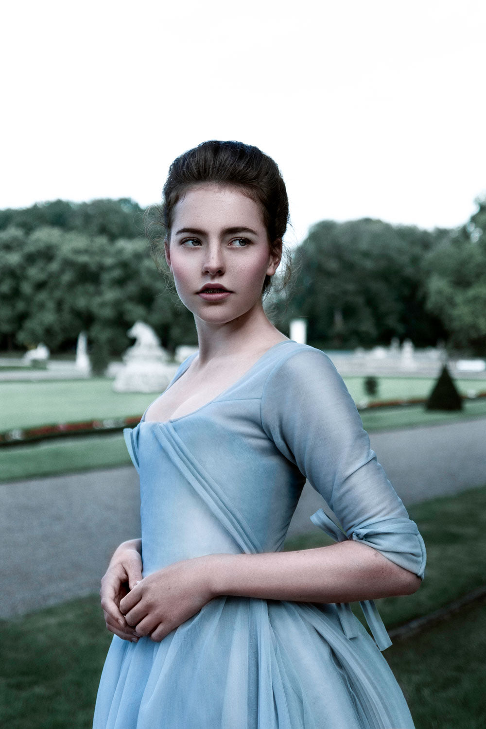 The dress, like its historical model, consists of a skirt, a jacket with a long train and a plug, and a skin tone bodice.
