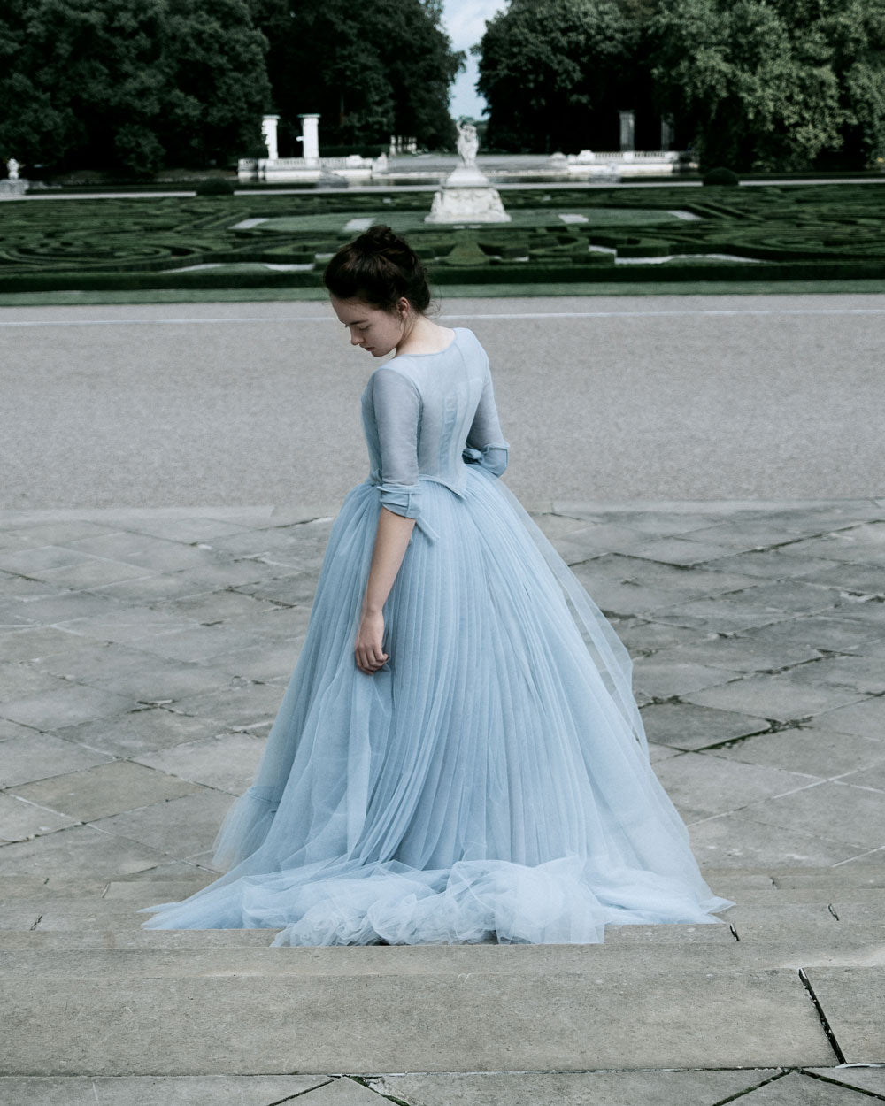 This 18th-century tulle dress is inspired by a robe á l'Anglaise from 1785-87. The many layers of tulle give the dress a depth that is complemented by the subtle but historically-inspired embellishments.