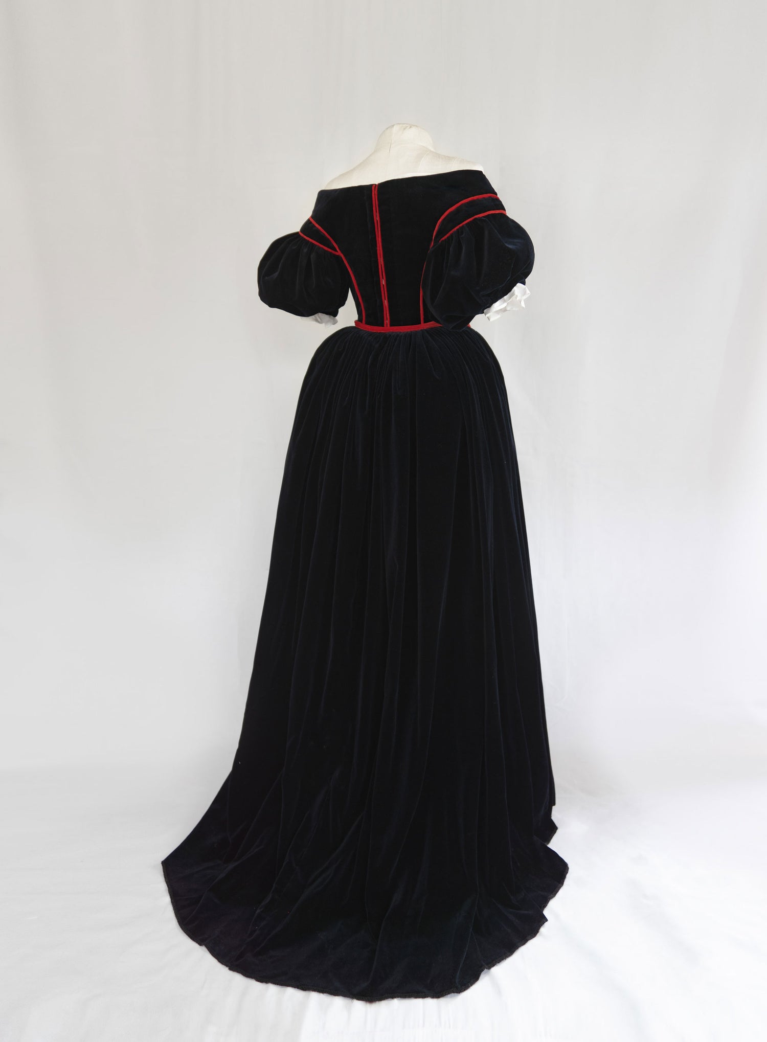 This dark blue velvet dress is a historically inspired version of a snow white dress. it combines the classic colors of red, yellow and blue in a 17th century cut. The subtle red piping and golden yellow underskirt give the dark blue dress an elegant look.