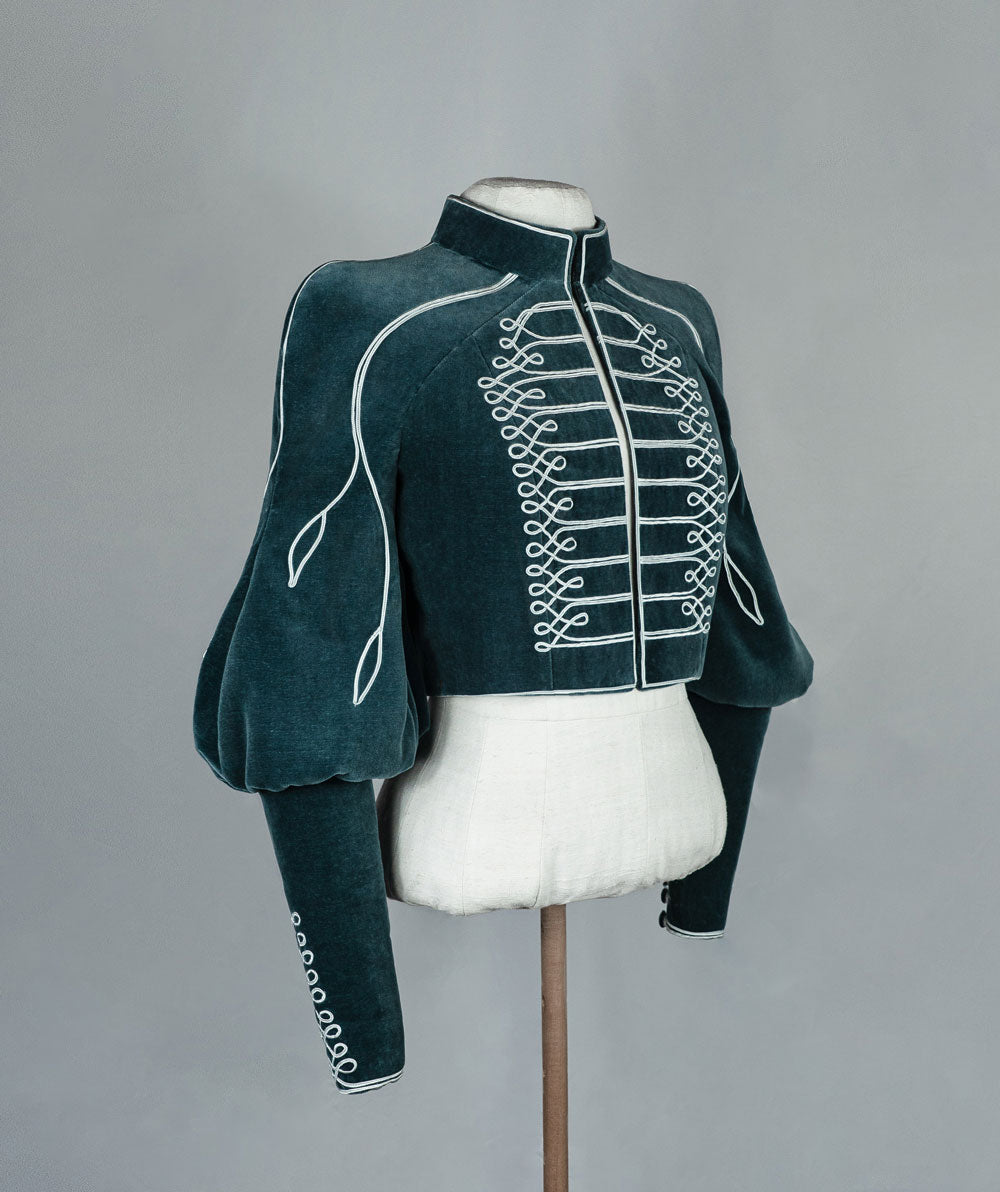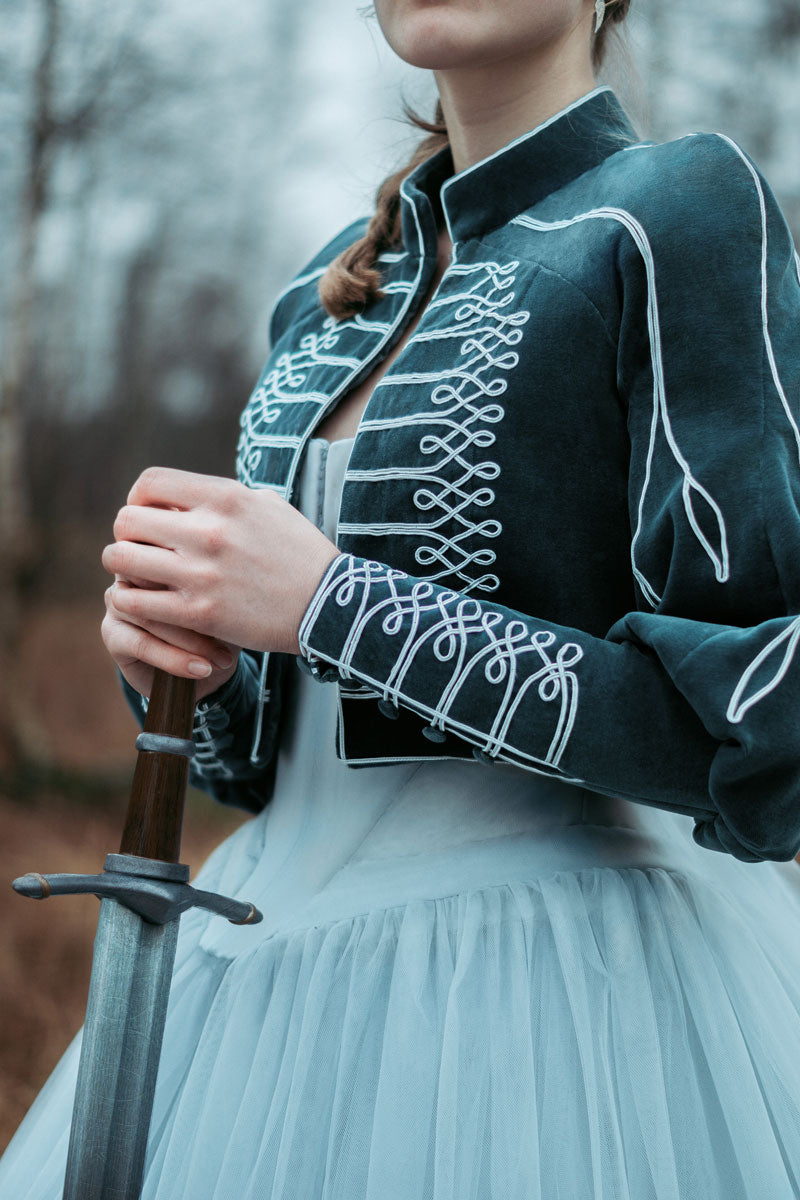 Inspired by historical uniforms, this jacket combines military elements with floral shapes. The silver soutache ribbon stands out elegantly against the dark green velvet and gives the jacket a fairytale look.