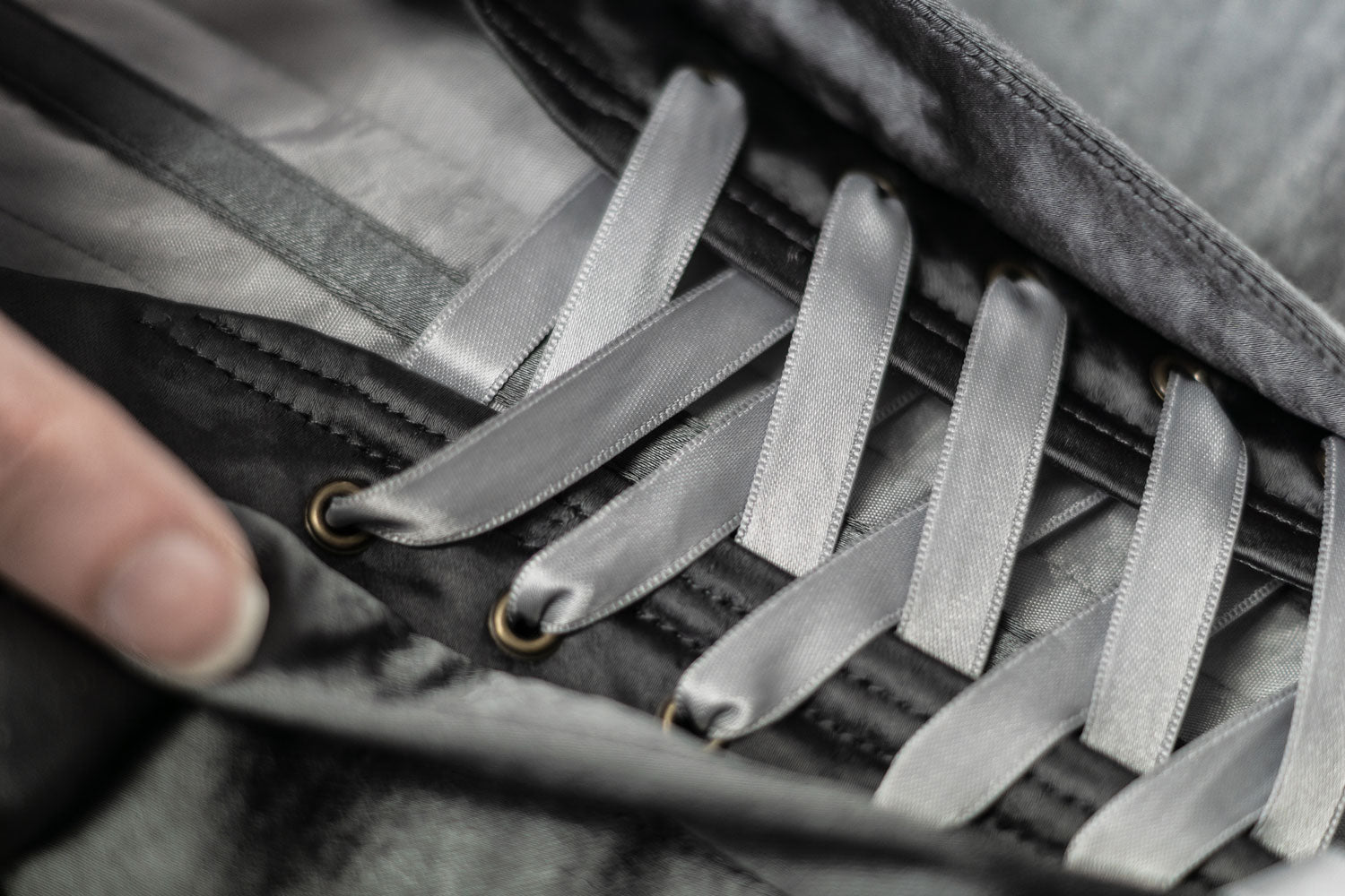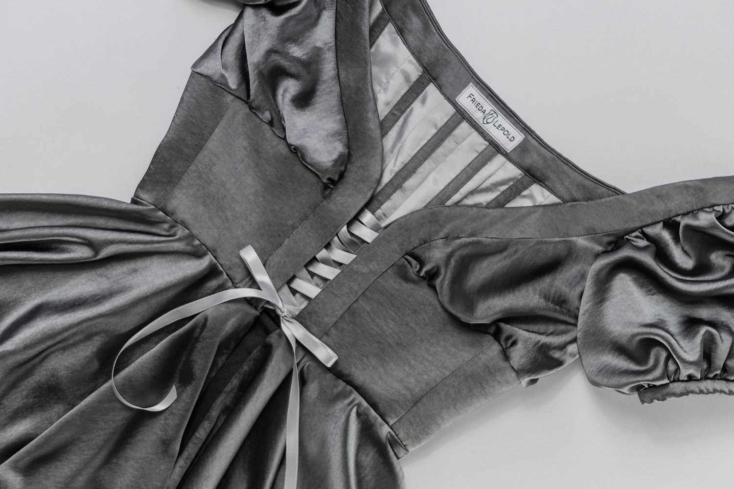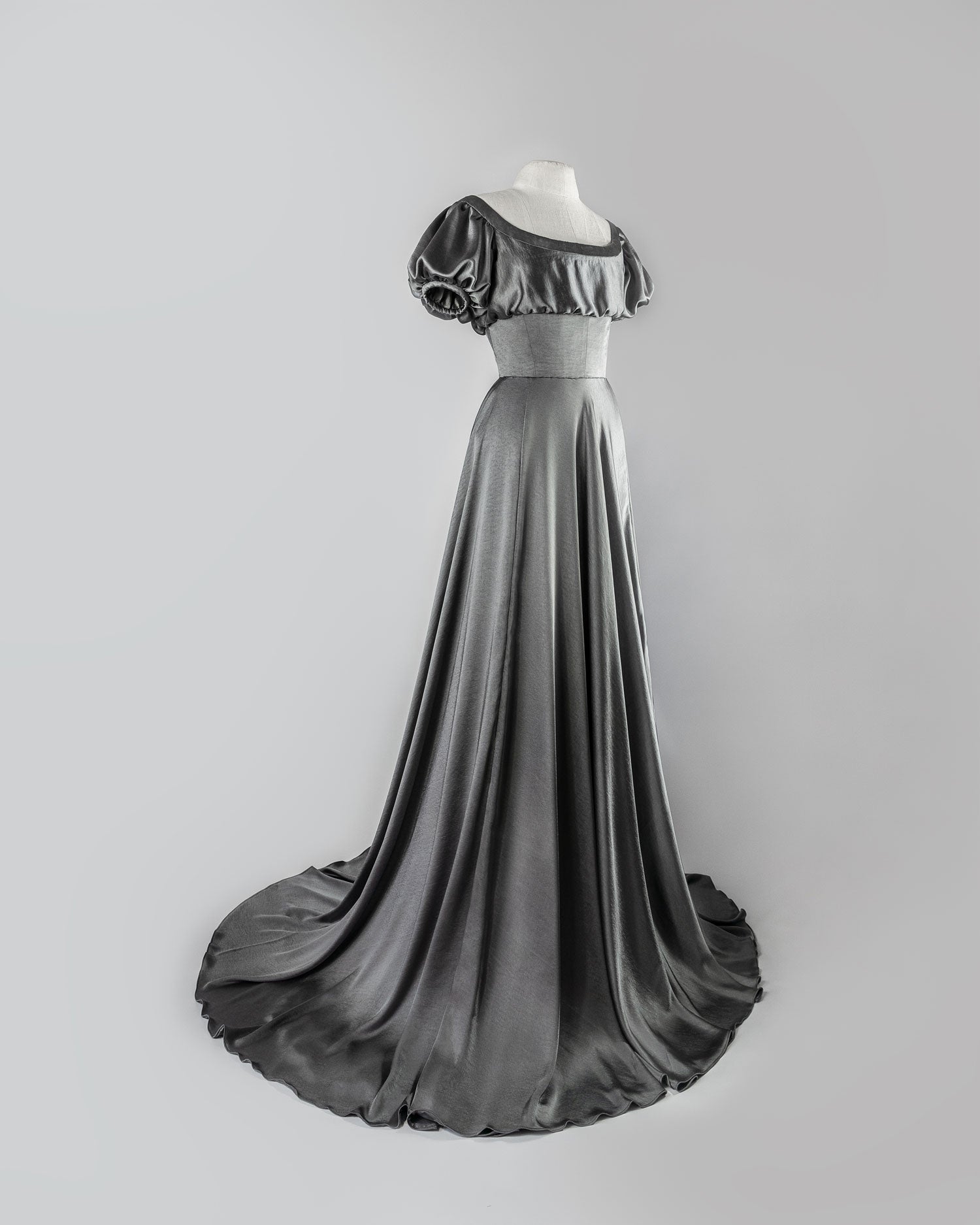 This dress is inspired by the tunics and dresses from ancient times, often seen on stone angel statues. Sewn from a flowing gray fabric, the dress has a low back neckline, short sleeves, and a wide long skirt.